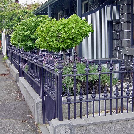 Dwarf liquidamber trees replace the over-sized wattle which blocked light and cracked walls, returning a controlled formality to the small front garden.