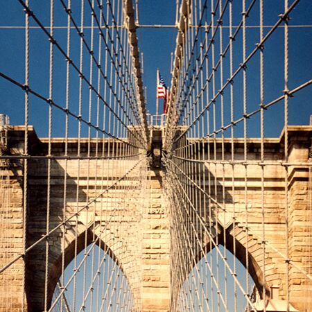 Brooklyn Bridge, with solid, cathedral towers & webs of steel rope : the world's best bridge