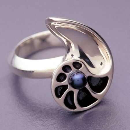 silver and black pearl ring inspired by a chambered nautilus, made by the architect